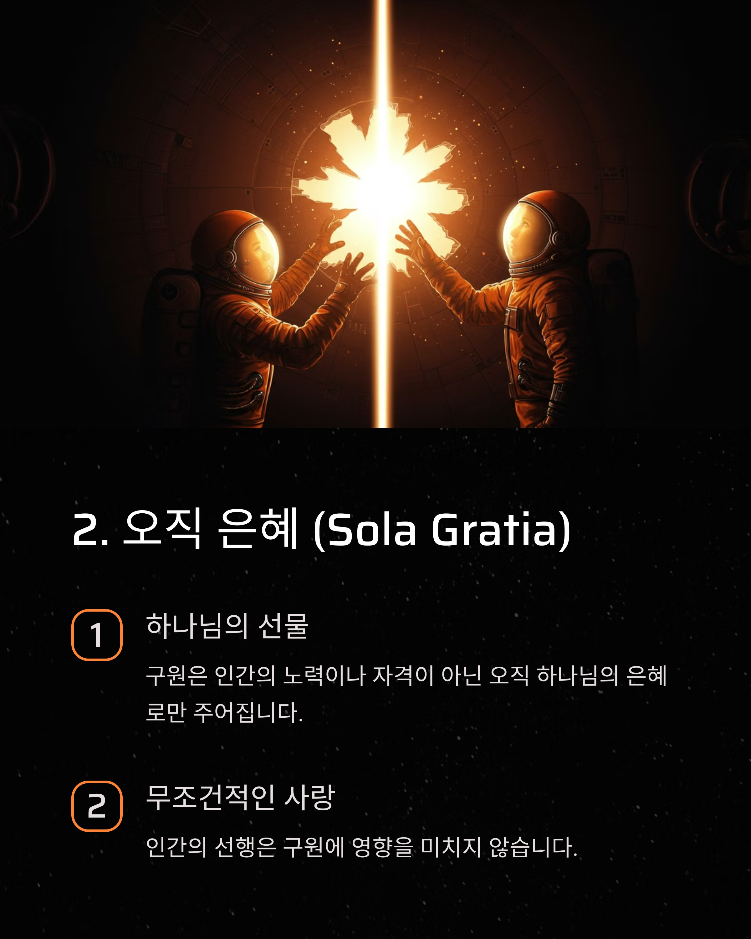 - 구원은 오직 하나님의 은혜로만 가능하다는 원칙입니다. 인간의 선행이나 공로는 구원에 아무런 영향을 미치지 못합니다.