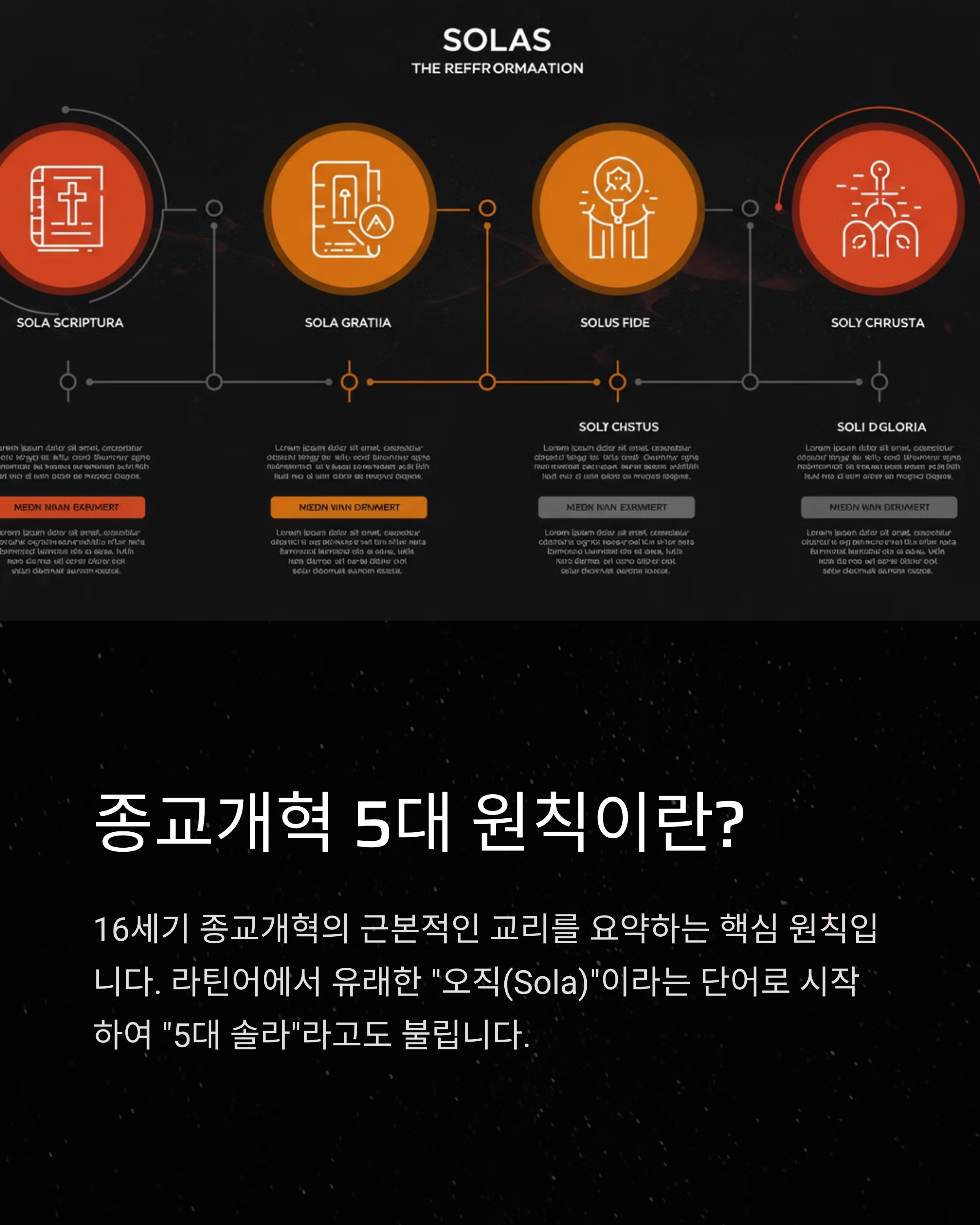 종교개혁자들의 5대 원칙은 다음과 같습니다. 라틴어 단어 ‘오직’을 뜻하는 ‘솔라(Sola)’로 시작하는 명칭들로 인해 ‘5대 솔라’라고도 불립니다.